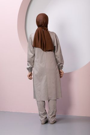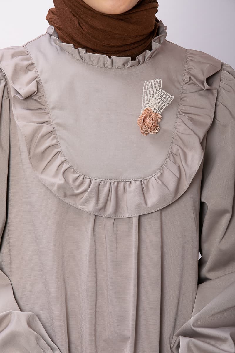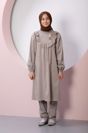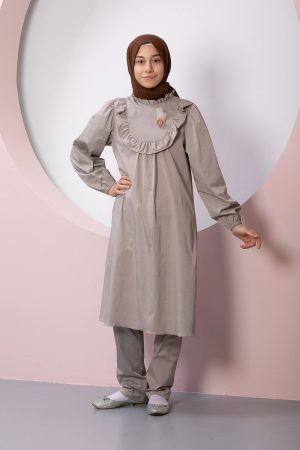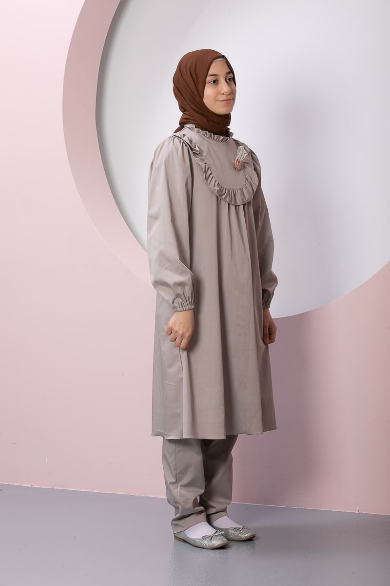 Product Features: Our child hijab two-piece set, Asel model dress, features frilled gathers, a brooch accessory on the yoke, elasticated sleeves, and a hidden zipper at the back. The trousers have an elasticated waistband.