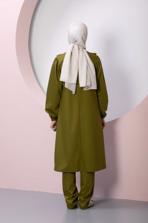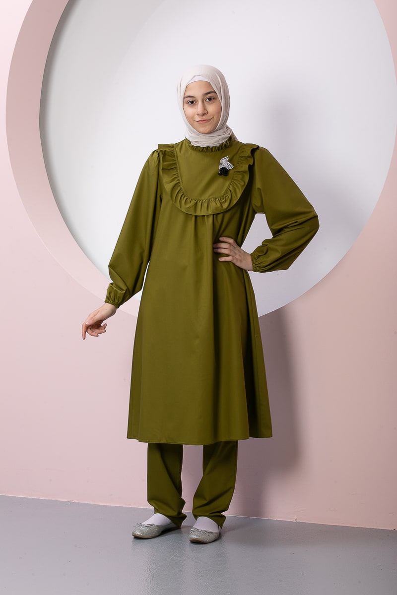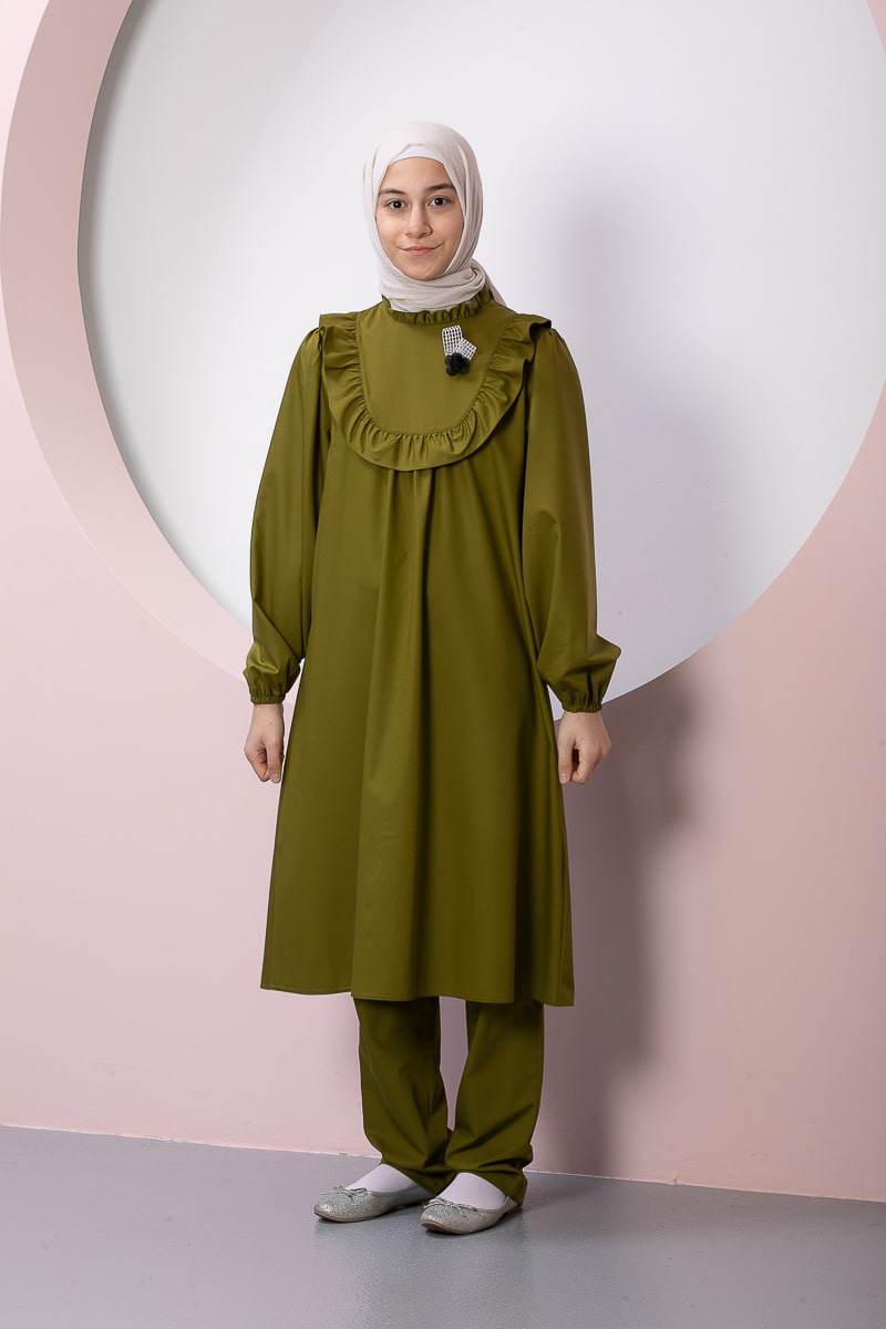 Product Features: Our child hijab two-piece set, Asel model dress, features frilled gathers, a brooch accessory on the yoke, elasticated sleeves, and a hidden zipper at the back. The trousers have an elasticated waistband.