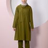 Product Features: Our child hijab two-piece set, Asel model dress, features frilled gathers, a brooch accessory on the yoke, elasticated sleeves, and a hidden zipper at the back. The trousers have an elasticated waistband.