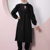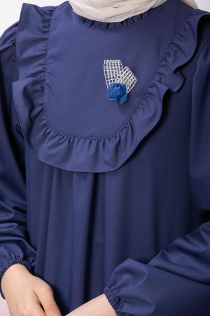 Product Features: Our child hijab two-piece set, Asel model dress, features frilled gathers, a brooch accessory on the yoke, elasticated sleeves, and a hidden zipper at the back. The trousers have an elasticated waistband.